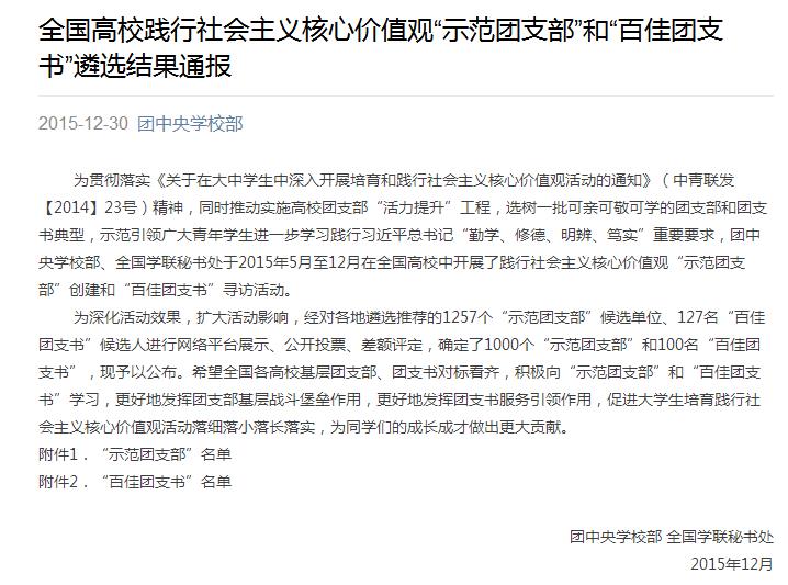 2015年5月至12月,为推动实施高校团支部“活力提升”工程,选树一批可亲可敬可学的团支部和团支书典型,示范引领广大青年学生进一步学习践行习近平总书记“勤学、修德、明辨、笃实”重要要求,团中央学校部、全国学联秘书处在全国高校中开展了践行社会主义核心价值观“示范团支部”创建活动。通过对各地推荐的1257个“示范团支部”进行遴选、展示、公开投票、差额评定、审核,91传媒 贸经1302班团支部被授予国家级“示范团支部”荣誉...