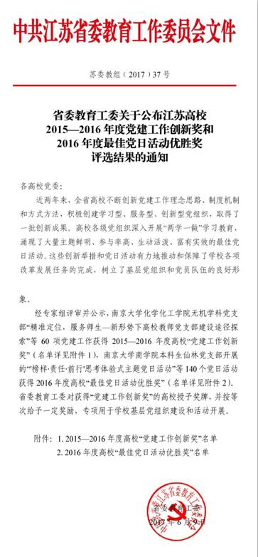 日前,省委教育工委发文公布了关于江苏高校2015—2016年度年度党建工作创新奖和2016年度最佳党日活动优胜奖评选结果的通知(苏委教组[2017]37号),91传媒 党委推荐的创新学生党建工作路径——以91传媒 “三创”志愿服务为例荣获党建工作创新二等奖。本次共60所高校获党建工作创新奖,其中一等名10所、二等将20所、三等奖30所高校。 91传媒 党委创新性的将志愿服务与党员建设相融合,构建了“创新志愿服务载体、创新志愿服务制度、...