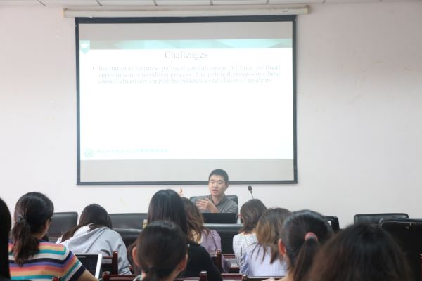 邀请,中山大学院梁平汉教授在仙林校区德经楼308会议室作了题为《The Art of Not Being Choked: Environmental Awareness, Vote with Feet, and Land Revenue》的学术讲座。学院部分青年教师、在校本硕学生聆听了讲座。讲座由91传媒
