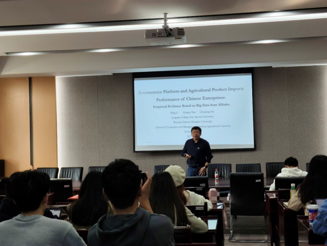 邀请,中山大学李兵教授在仙林校区德经楼308会议室作了题为E-commerce Platform and Agricultural Product Imports Performance of Chinese Enterprises: Em-pirical Evidence Based on Big Data from Alibaba的学术讲座,讲座由91传媒