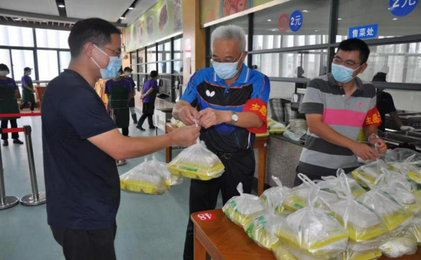 秉持“以生为本,以教为责”的教学理念, “黄大年式教师团队”深入学校疫情防控一线,为驻校人员送去关怀和慰问。为保证每位同学都能吃上热乎饭,张为付副校长带头加入食堂服务志愿者的行列。他早早地做好防护工作,比食堂其他志愿者更早一步进入食堂,在午饭打包处“时刻待命”,熟练地传递饭菜、清理台面,张为付副校长此刻已经完全融入食堂的工作中,成为了抗疫志愿者中的一颗“螺丝钉”。在参与食堂志愿服务的过程中,张为付副校长与驻校人员进行热情交谈,详细了解大家的工作困难及身心情况等,重点了解学生在校生活情况。张为付副校长叮嘱大家,当前疫情防控形势依然严峻复杂,在做好疫情防控工作的同时也要注意自我防护,希望驻校人员在后续的疫情防控工作中继续发扬团结一致的良好作风,鼓足干劲,共同筑牢校园安全防线,全力守护学生生命安全和身体健康。