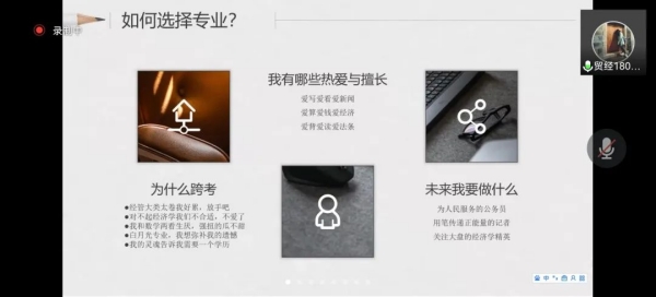 在同学们积极提问的氛围中,陈丹妮学姐重点和大家分析了促成自己成功上岸北京大学的几个因素。陈丹妮学姐一开始不打算考研,但受到学长的影响,去了解了北京大学的专业,选择了自己喜爱的体育产业与大健康管理硕士,并为之努力,成功上岸。她给同学们的建议是不要给自己设限,也不要受外界氛围的影响局限于热门专业,立足于自己的热爱并坚定走下去。