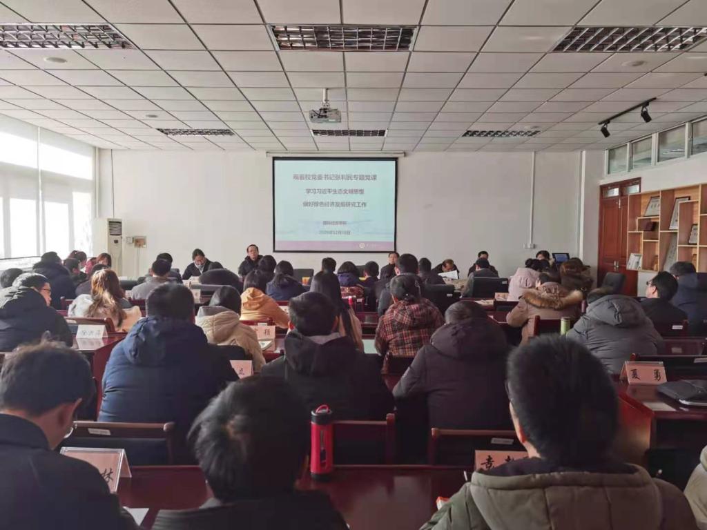 12月16日,91传媒 组织全体教职工在德经楼308会议室集中观看校党委书记张利民专题党课《学习习近平生态文明思想 做好绿色经济发展研究工作》。