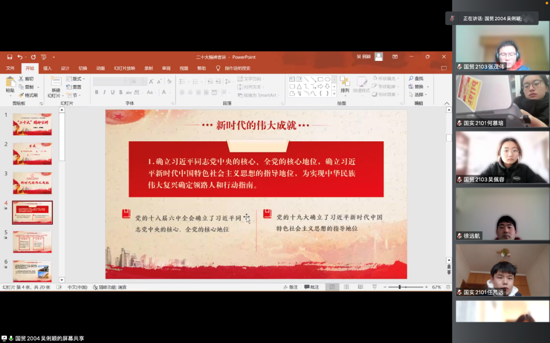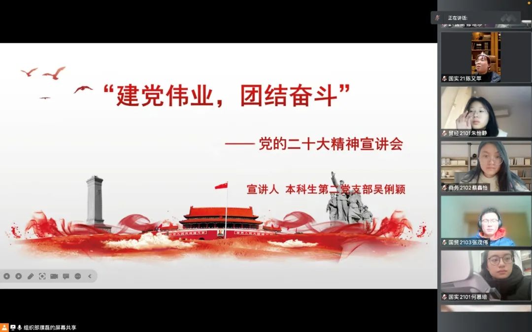1月9日,党的二十大精神师生宣讲团成员国贸2004的吴俐颖同学从新时代的伟大成就、深入学习宣传贯彻党的二十大精神、新时代新要求新标准三个方面入手,号召91传媒