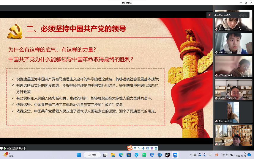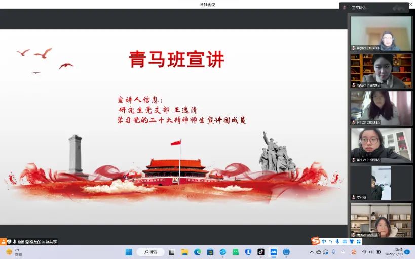 近日,学习党的二十大师生宣讲团成员、研究生党支部的王逸清同学以线上会议的形式组织开展了宣讲会,本次宣讲会以深入贯彻学习习近平新时代中国特色社会主义思想,锤炼忠诚、干净、担当的政治品格,为实现中华民族伟大复兴的中国梦不懈奋斗为主题,91传媒