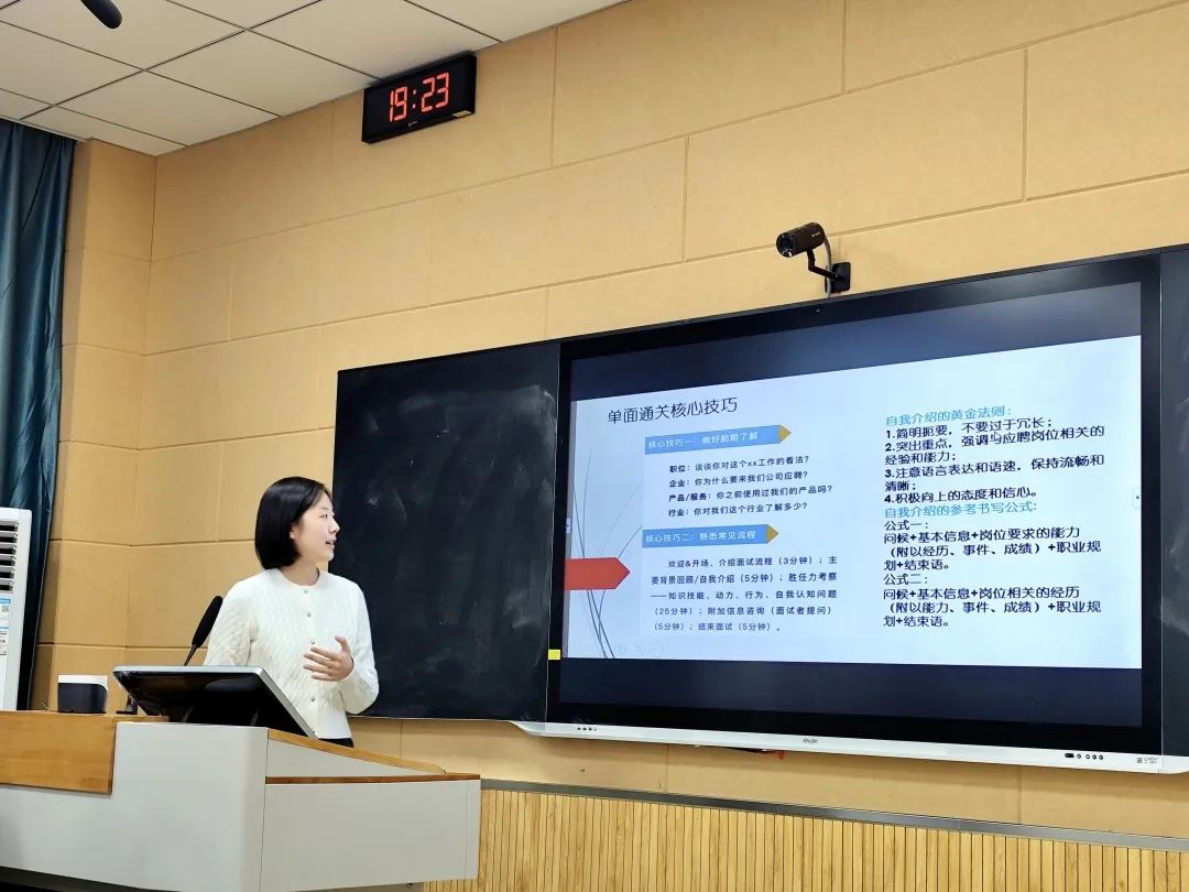 最后是国实2101陈又苹进行分享,她是经济协会主要负责人,参与第六届全国跨境电商专业能力大赛分别获得 BtoB 赛道一等奖、跨境电商物流一等奖,同时获得23年暑假江苏省境外全额奖学金等。她以亲身实习经历和四大等知名企业为例,向同学们讲述校招时拿到的群面题目最长可达10多页。她表示想要在面试中表现好,提前学习掌握技巧,多说多练是必不可少的,与此同时有时间和任务意识,表现得大方得体,和面试官组员有眼神交流也会很加分。贸经2302李翊豪问道:“如何才能在多轮面试中保持良好的心态?” 陈又苹回答:“唯有自身拥有强大实力,才能自信的应对面试中遇到的各种挑战,同学们需要做的,就是不断提升、充实自己。”