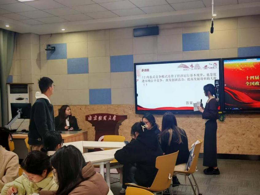 为了提升学习实效,学院设计“两会知多少”趣味知识竞赛。题目涵盖“内卷式竞争”“提振内需路径”等热点。通过单选、多选及判断题型的综合比拼,同学们在抢答中深化对政策的理解。