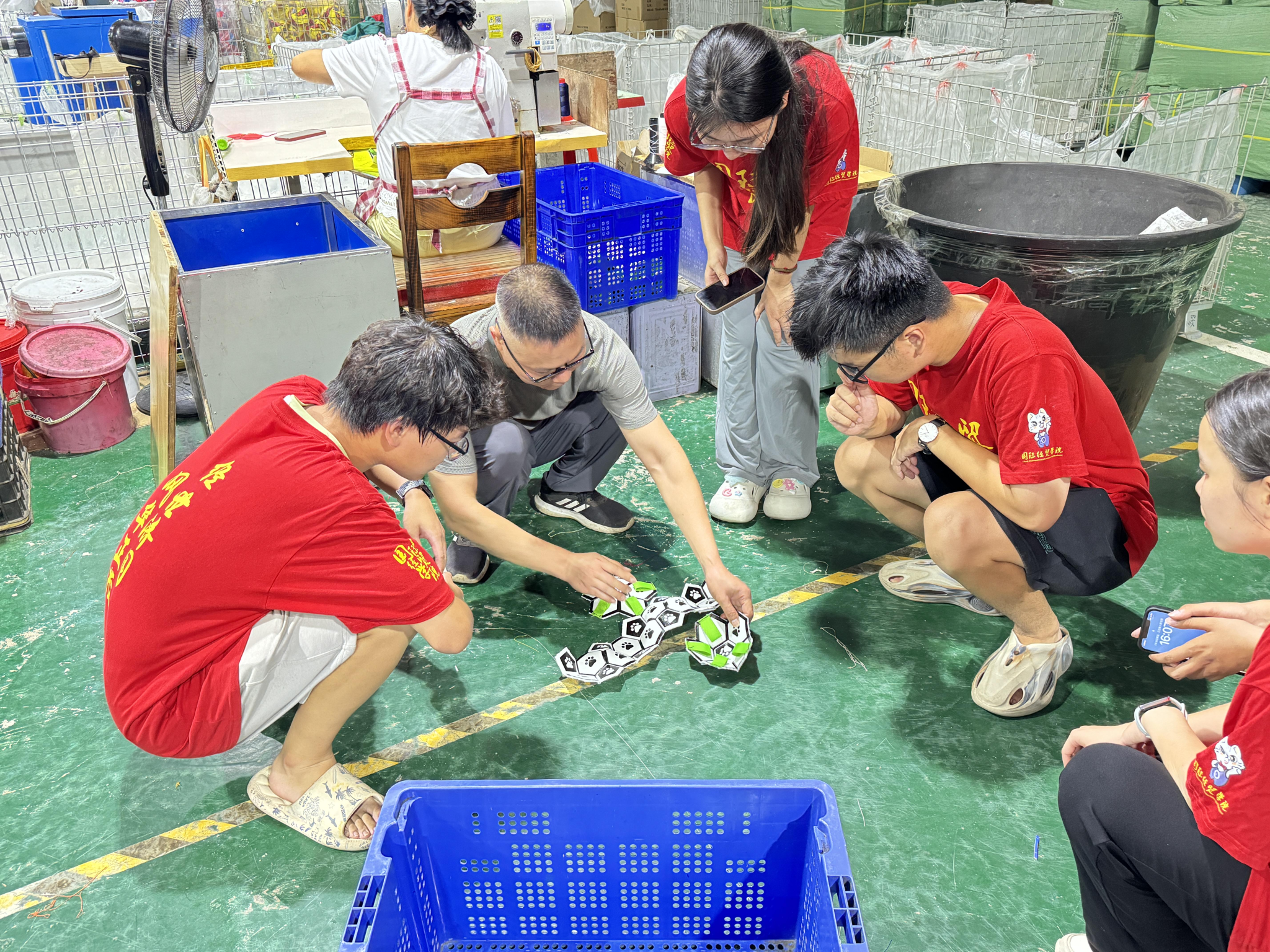 刚走进黑鹰体育的生产车间,就听见机器嗡嗡地转着,工人们低着头专注地缝制足球,一片忙碌的景象。实践团队从第一道裁皮料工序开始,系统了解足球、宠物球等产品的生产流程。工人使用专用工具将从义乌采购的皮料裁剪成规定尺寸的片状,支持红、黑、灰等多种颜色按订单需求定制。随后,裁好的皮料进入丝印车间,印制客户指定的图案、商标及“中国制造”标识,同时根据幼儿、青少年、成人等不同使用群体精准调整模板尺寸。