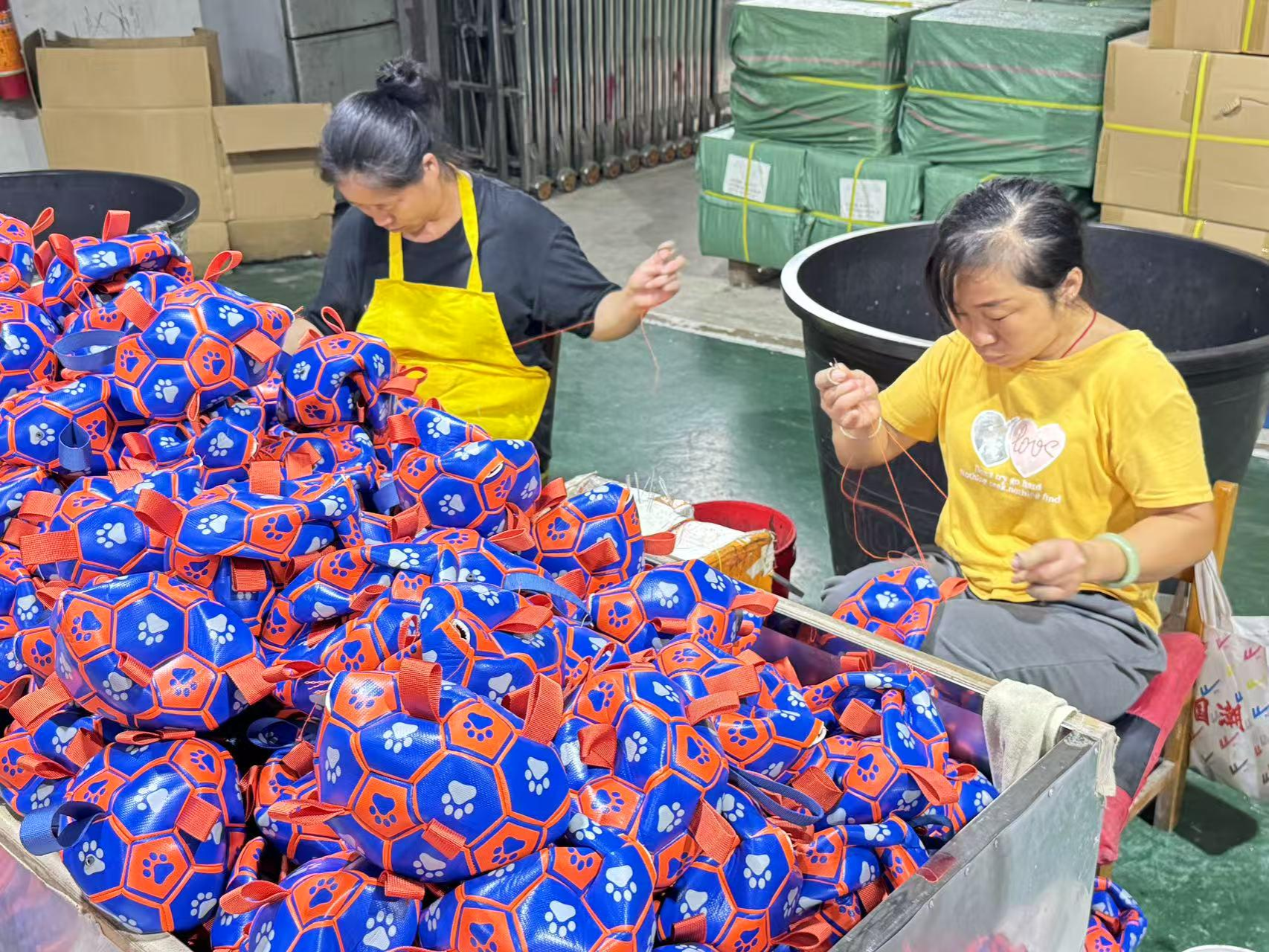 缝合工序中,工人用普通缝纫机将皮片缝成两个半球状“帽子”,熟练者日可完成100-200个;球壳组装时两半球与“腰带”快速拼合,日产200件;随后安装普通黑色或缠绕棉线型球胆,后者成本高5元,可防漏气;最后手工缝合收口,每针间距精准,此工序机器无法替代,保障球体圆润密封。成品经24-48小时充气测试和检测框验漏后进入包装,发货多通过广东、深圳、宁波等港口海运,发往俄罗斯则走铁路专线,以此控制物流成本。“每天能产8000个球,宠物球占大头,像大象、兔子这些造型在欧美特别好卖。”总经理覃勇干的介绍,让团队对产品结构有了清晰认知。
