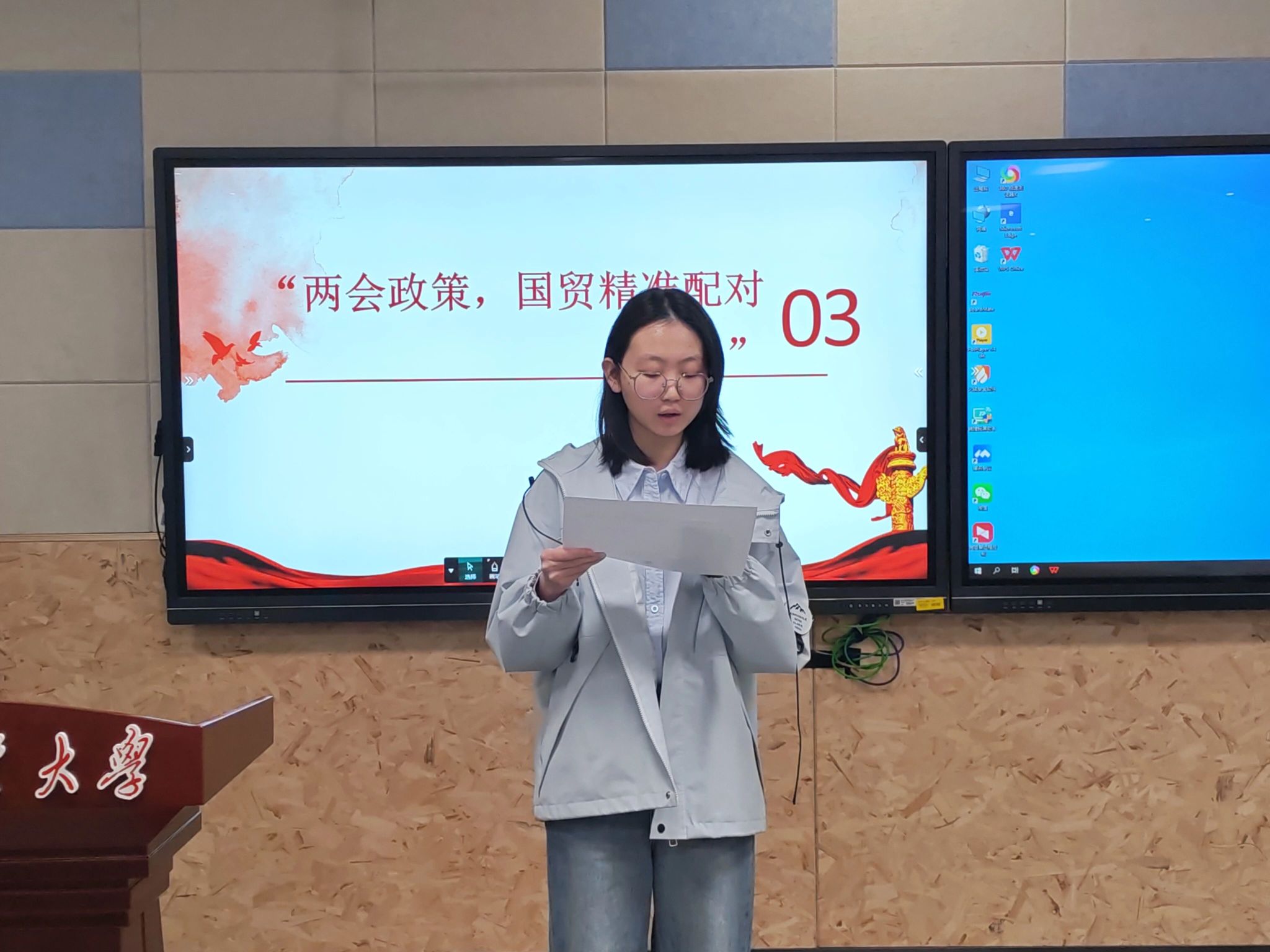 将宏观政策落足于微观专业实践,是本次专项活动的核心。在“国贸精准配对赛”环节,工作人员向各小组发放了10条两会政策条,3条专业方向条(国际经济与贸易、贸易经济、电子商务),要求各小组完成政策与专业的精准匹配并上台分享逻辑。现场学子们围绕政策导向与专业发展展开热烈讨论:将“扩大内需战略”与贸易经济专业关联,解读国内消费升级带来的商贸业态创新;将“深化人工智能+应用”与电子商务专业结合,分析智能营销、数字贸易的发展机遇。这场头脑风暴,让宏大的两会议题具象化为明晰的专业发展路径,也让学子们真切明白:自己不是在“读死书”,而是在为“十五五”商贸领域的发展储备知识,为未来的职业发展提前“卡位”。