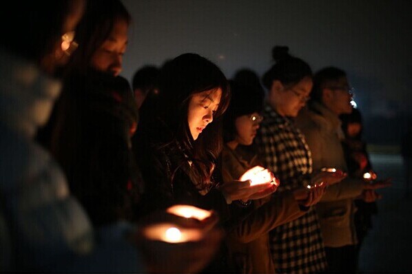 学生用蜡烛摆起了“1937.12.13”的字样,对南京大屠杀遇难同胞表示深切悼念。