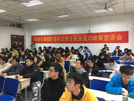 在仙林校区德经楼Z-112教室成功举办南京市栖霞区青年大学生就业见习政策宣讲会,邀请了南京市栖霞区人社局职培科宣讲员董蕾娜等5位宣讲员、91传媒