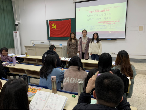 2021年12月11日,91传媒 本科生第一党支部在在德经楼108教室召开预备党员转正支部大会,讨论本支部汪子欣、赵利、吴川丽3名预备党员按期转正事宜,支部大会由本科生第一党支部书记孙绪华主持,支部大会应到党员48人,实到党员48人,其中有表决权的正式党员8人,实到正式党员8人。